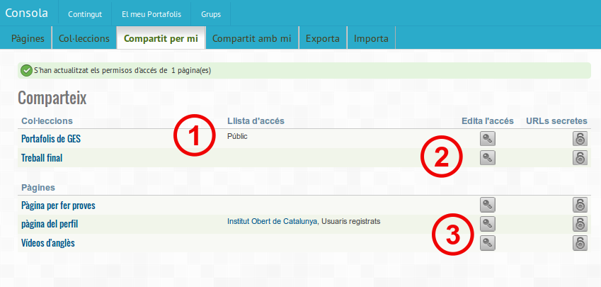 - Veuràs la col·lecció o col·leccions que tens (1) En aquest exemple en tenim una pública i una privada (sense compartir). En el cas de voler compartir la que a hores d'ara només podem veure nosaltres, hem d'editar-ne l'accés (2)