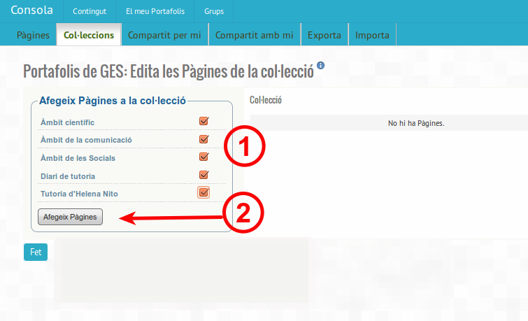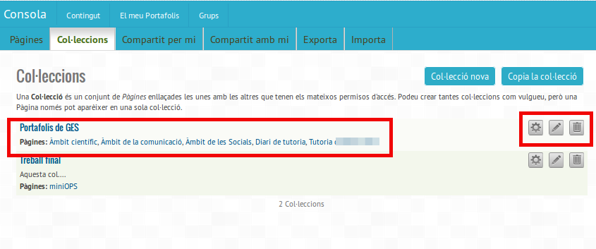 Una col·lecció és un conjunt de pagines. Si en vols crear una, des de la consola del teu portafolis clica a Col·leccions i tindràs la possibilitat de crear-ne una de nova (1) o de copiar-ne una (2) si la persona propietària ha donat permisos de còpia.