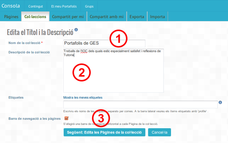 Escriu el Títol a (1), escriu la Descripció de la col·lecció a (2) i si vols, les etiquetes que identifiquen el contingut de la col·lecció. Per continuar clica el botó Següent: Edita les pàgines de la col·lecció (3).