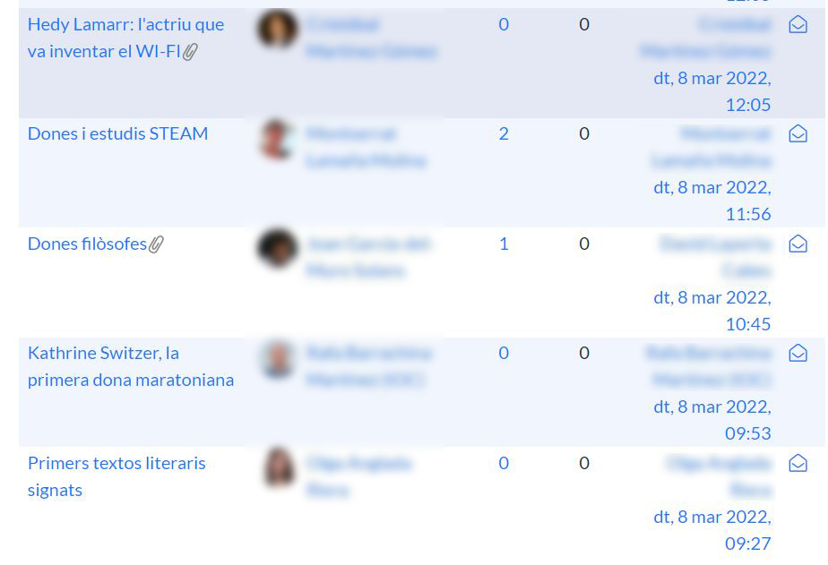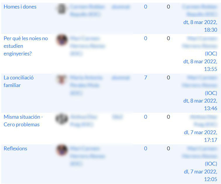 - En cadascun dels estudis s’ha obert un fòrum titulat: Sabies que….? L’objectiu d’aquest és ajudar-nos a prendre consciència que encara queda molt camí per recórrer. Per tractar de donar visibilitat a alguns fets que ens passen desapercebuts i que evidencien que les dones continuem patint discriminació.