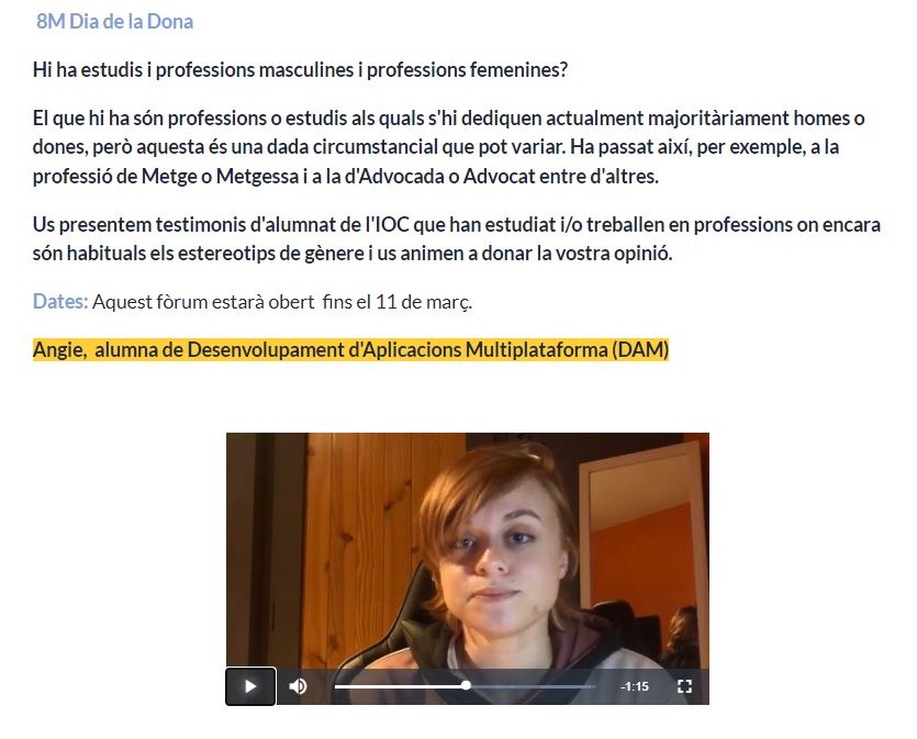 - Dins l’aula Atenció a l’estudiant / Comunitat FP també s’ha obert un altre fòrum titulat: Trenquem estereotips. On es presenten testimonis d’alumnat de FP de l’IOC que han estudiat i/o treballen en professions on encara són habituals els estereotips de gènere.