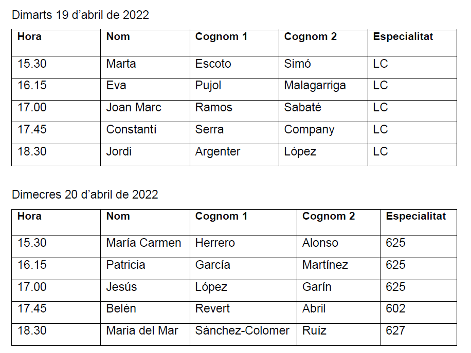 Cada persona convocada és suplent de la persona anterior, excepte la primera persona convocada del dia, que no és suplent de l’última del dia anterior.