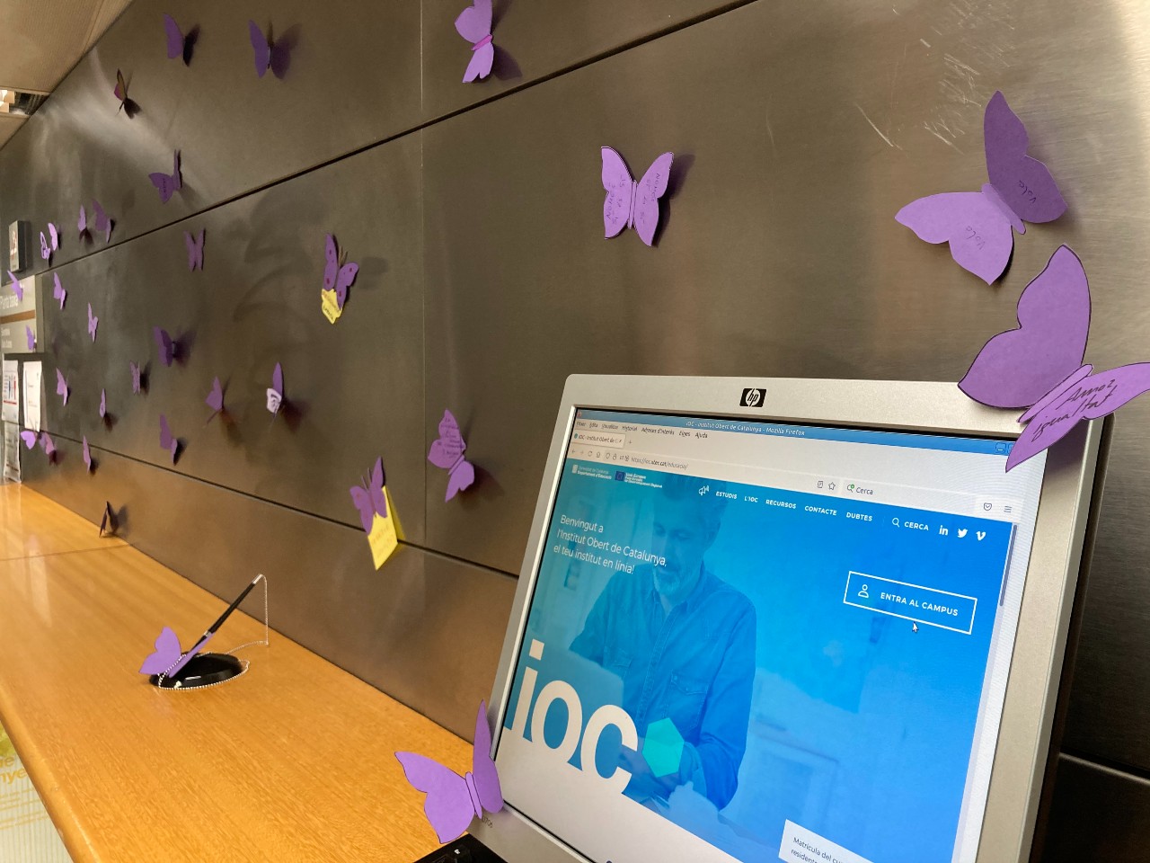 Al llarg de la setmana, el hall del centre s’ha omplert de papallones de color lila, retallades i enganxades per tot el personal del centre. Amb l’objectiu de difondre els valors de l’associació El latido de las mariposas.