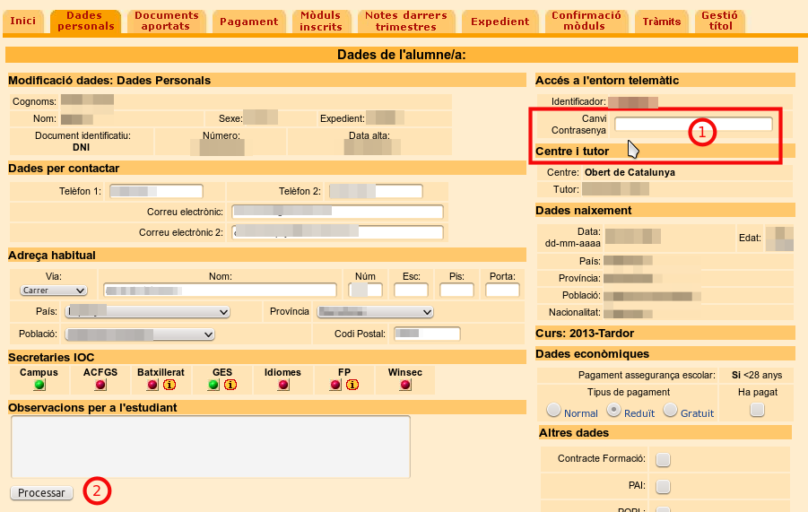 3. Escriu la contrasenya desitjada a la casella Canvi Contrasenya número (1) [+info: Contrasenyes segures]
