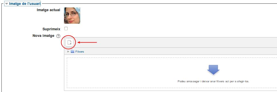 A la zona Imatge de l’usuari és on penjaràs la foto que t'identificarà. Pots penjar-la arrossegant-la fins a l’espai on veuràs aquest text: Podeu arrossegar i deixar anar fitxers ací per afegir-los, però també tens una altra opció per fer-ho: prémer la icona Afegeix (la que tens encerclada en vermell):