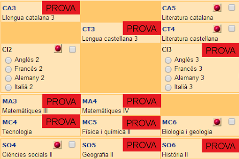 En els 9 mòduls marcats en vermell d'aquesta imatge la qualificació final ha de ser, com a mínim, de 5 per tenir dret a fer aquesta prova. Si la nota és inferior no podràs fer la prova i l'hauràs de tornar a cursar a partir del trimestre següent. Són aquests: