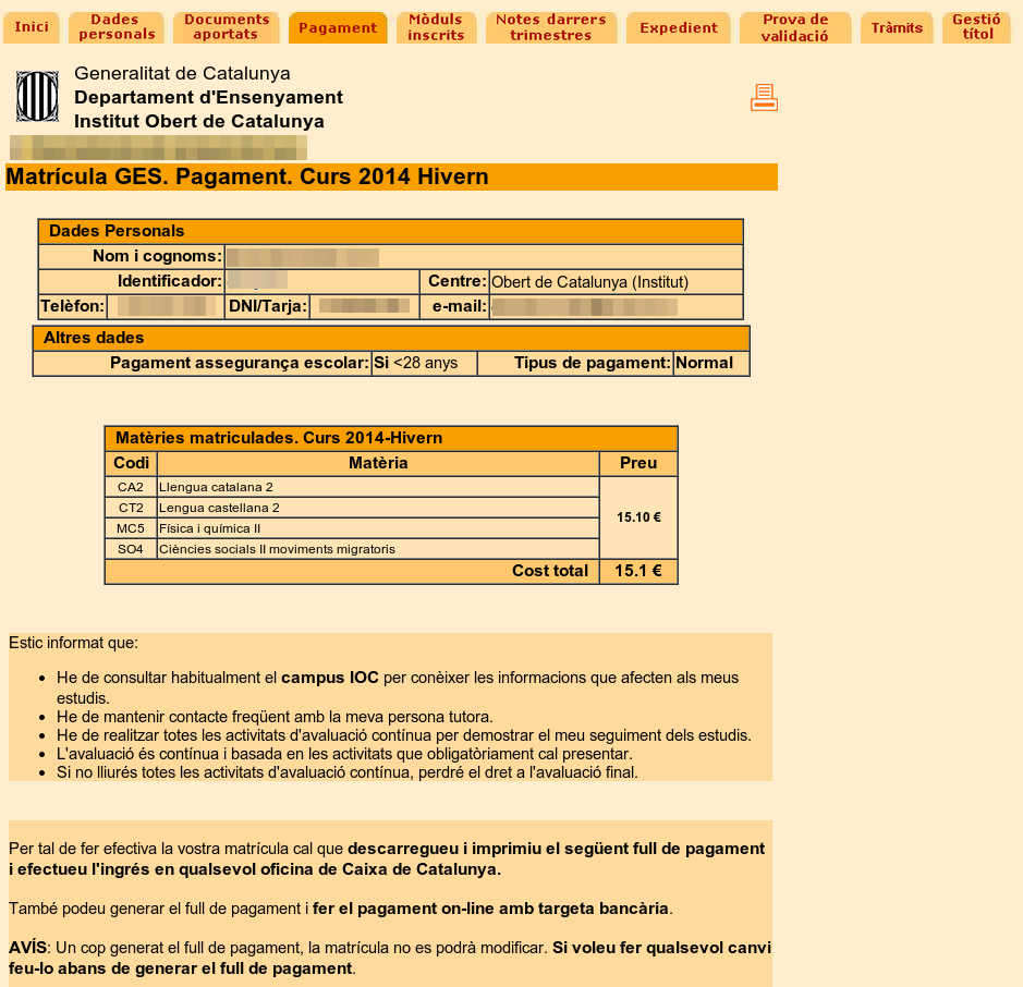 A la pestanya Pagament trobareu el resum de mòduls a què esteu inscrits i del preu que heu de pagar incloent, si escau, l’Assegurança escolar (pagament únic per tot el curs).