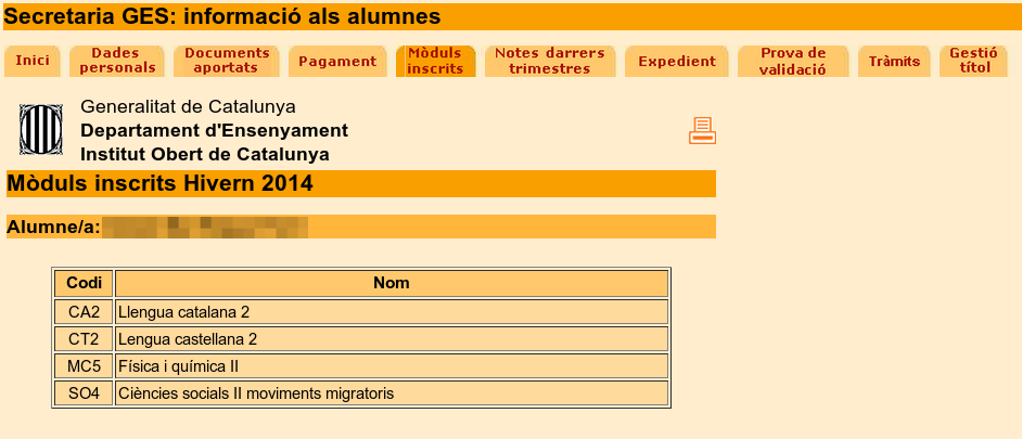 Es pot veure que apareix la llista de mòduls inscrits amb una indicació sobre la Prova de validació final: