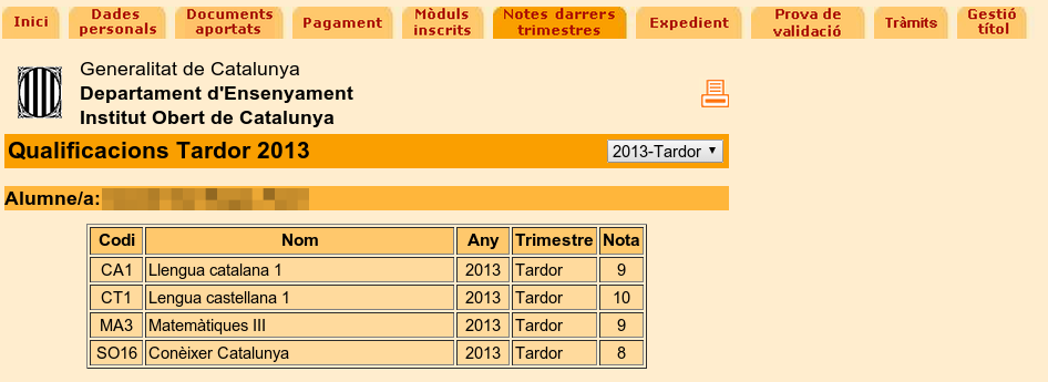 Durant la resta del temps d’estudi podreu consultar les qualificacions obtingudes en trimestres anteriors simplement triant-los del desplegable de la part superior.
