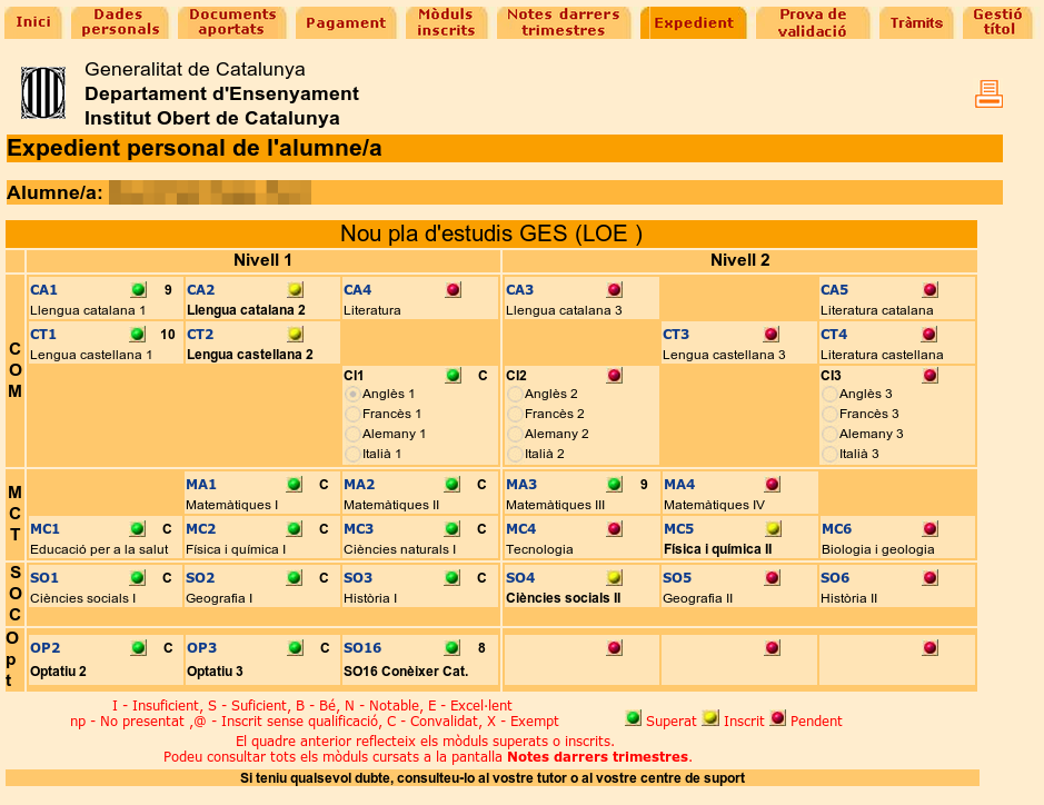 En aquesta pestanya podreu consultar el vostre expedient acadèmic: quins mòduls heu convalidat, acreditat o superat, en quins mòduls esteu inscrit i quins us falten per concloure el vostre itinerari formatiu seguint el codi de colors del peu.