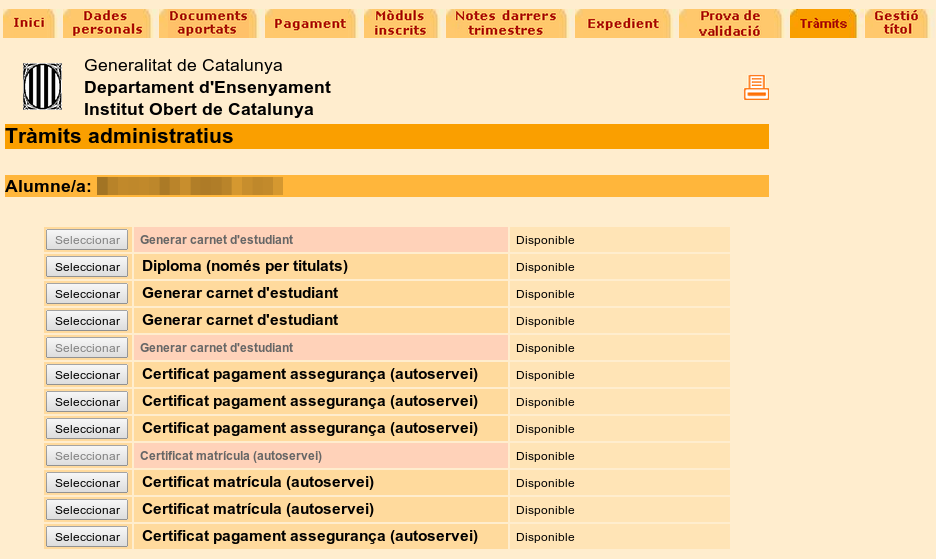 Des d’aquesta pantalla podreu generar-vos una sèrie de documents de forma automàtica, en forma d’autoservei, i sense necessitat de demanar-ho a la vostra persona tutora.
