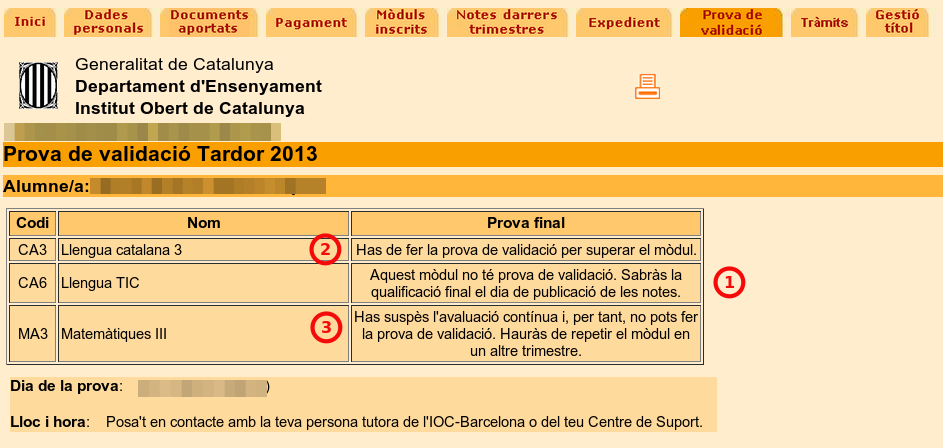 (3).- En el cas d’un *mòdul amb Prova de validació* obligatòria del qual no s’ha superat l’Avaluació contínua es diu *Has suspès l’avaluació contínua i, per tant, no pots fer la prova de validació. Hauràs de repetir el mòdul en un altre trimestre*.