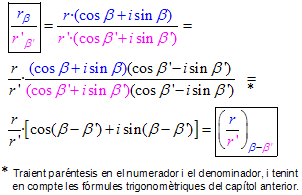 En canvi, com veurem de seguida, quan dos nombres complexos ens venen donats en forma polar, resulta senzillíssim multiplicar-los i dividir-los, perquè el producte de dos complexos té per mòdul el producte dels mòduls i, per argument, la suma dels arguments i, anàlogament, el quocient té per mòdul el quocient dels mòduls i, per argument, la resta dels arguments del numerador i del denominador.