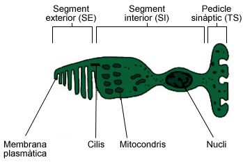 - Recepció de la informació. La llum arriba a l’ull i estimula els òrgans receptors –les cèl·lules fotoreceptores– de la retina, que transformen l’estímul lluminós en impuls elèctric i el transmeten com a senyal del nervi òptic cap al tàlem, i aquest cap al còrtex cerebral.