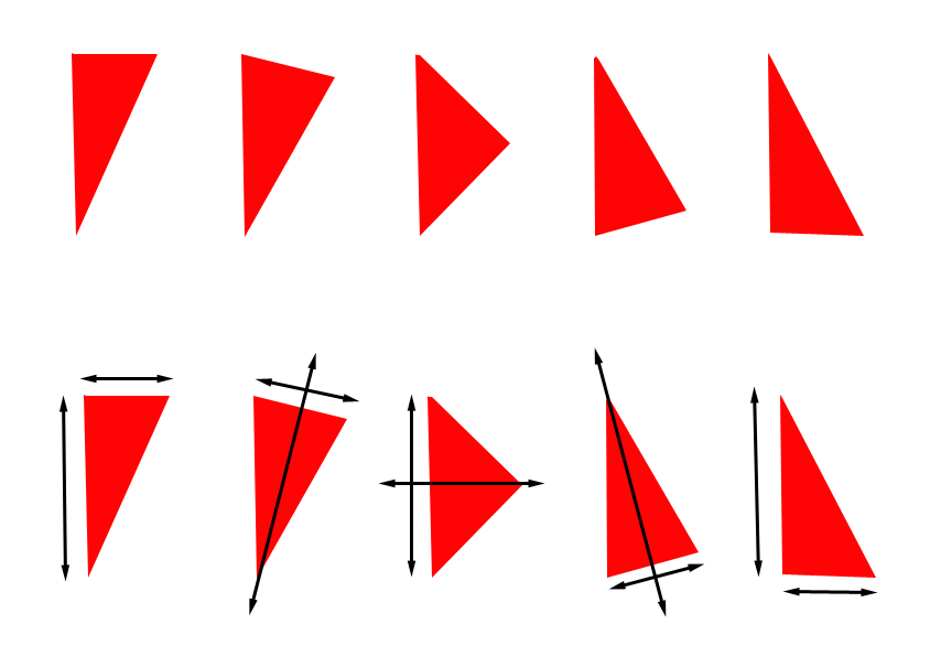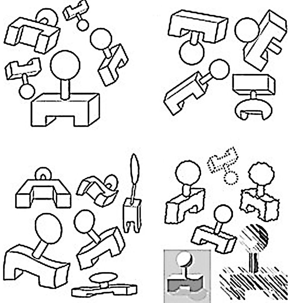 - Invariància: reconeixement i percepció de les formes i contorns per sobre d’altres qualitats, com el color o les textures. Per exemple, a la figura, malgrat les variacions i les distorsions, podem identificar i reconèixer el mateix objecte en perspectives, deformacions o estils gràfics diferents.
