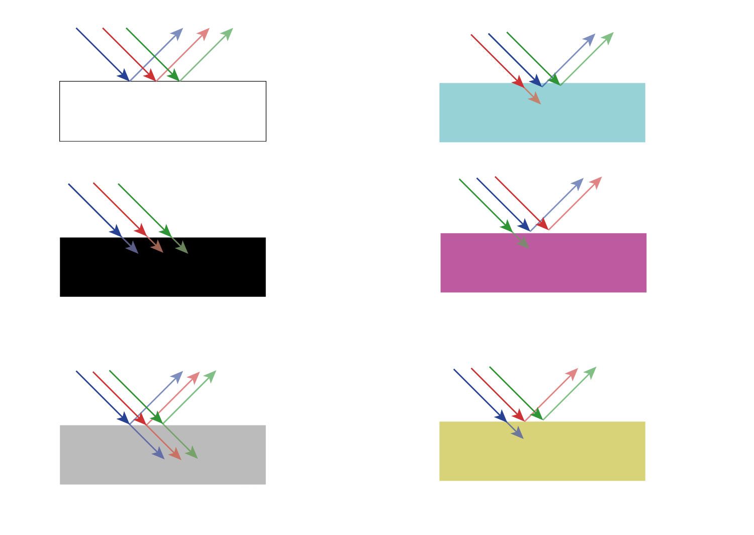 Els objectes absorbeixen una part de la llum que reben en funció del material de què estan fets; i en reflecteixen una altra, que és el color que nosaltres percebem. Si aquest material és transparent o semitransparent, una part de la llum es refracta. Segons la superfície que tingui, si és molt polida, es reflecteix tota la llum incident i no podem veure el color de l’objecte, sinó una imatge del seu entorn (com un mirall).
