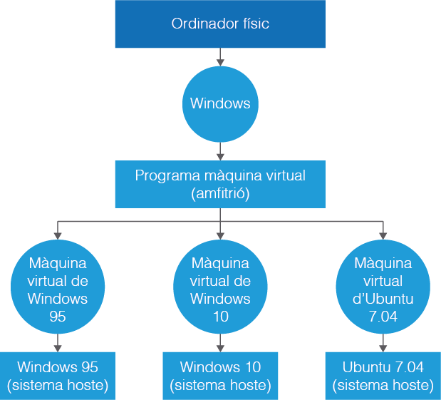 Quan es parla de virtualització existeix una terminologia fonamental que inclou termes com ara sistema operatiu host o amfitrió, que és el sistema operatiu de l’equip físic en el qual s’ha instal·lat VirtualBox, i sistema operatiu convidat, que és el sistema operatiu que s’ha instal·lat i s’està executant dins de la màquina virtual.