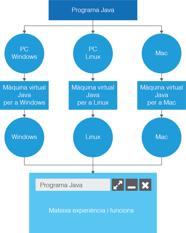 D’altra banda, la màquina virtual de procés (figura) és menys ambiciosa que l’anterior. En comptes de simular un PC per complet, executa un procés concret, com una aplicació, en el seu entorn d’execució. Sona una mica esotèric, però el fem servir cada vegada que executem una aplicació basada en Java o basada en .NET Framework, per exemple. Això és d’utilitat a l’hora de desenvolupar aplicacions per a diverses plataformes, ja que en lloc d’haver de programar específicament per a cada sistema, l’entorn d’execució (és a dir, la màquina virtual) és el que s’encarrega de tractar amb el sistema operatiu.