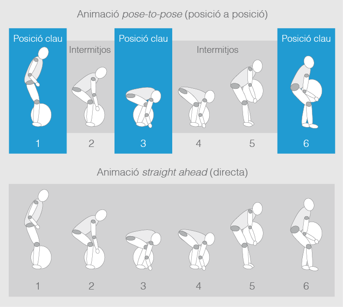- Interpolació d’imatges. El programa ens genera automàticament els fotogrames intermedis entre dos fotogrames clau (pose-to-pose). La interpolació pot ser lineal amb velocitat constant i sovint basada en una trajectòria definida, o pot ser una interpolació mitjançant corbes, amb les quals modifiquem l’acceleració i altres paràmetres al llarg de la línia de temps.