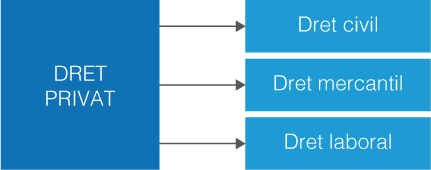 El dret privat reglamenta tot el que afecta l’individu i la relació establerta entre diversos individus. De vegades l’Administració pública actua com si fos un particular. Per parlar de dret privat, primer s’han de posar en valor les diferents disciplines que el conformen; és a dir, el dret civil, el dret mercantil i el dret laboral (vegeu la figura):