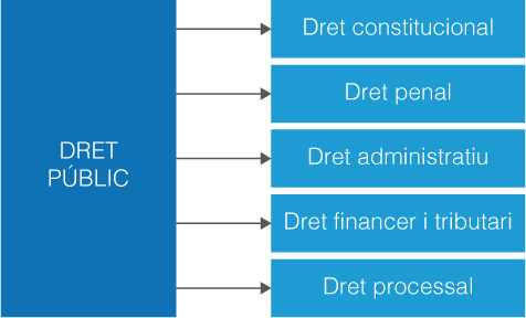 - Dret financer i tributari: és el conjunt de normes jurídiques que regulen les relacions entre els ciutadans i la Hisenda pública, és a dir, regulen com s’ha de recaptar, com administrar els recursos, la seva gestió i distribució per dur a terme les activitats i el funcionament de l’Estat.