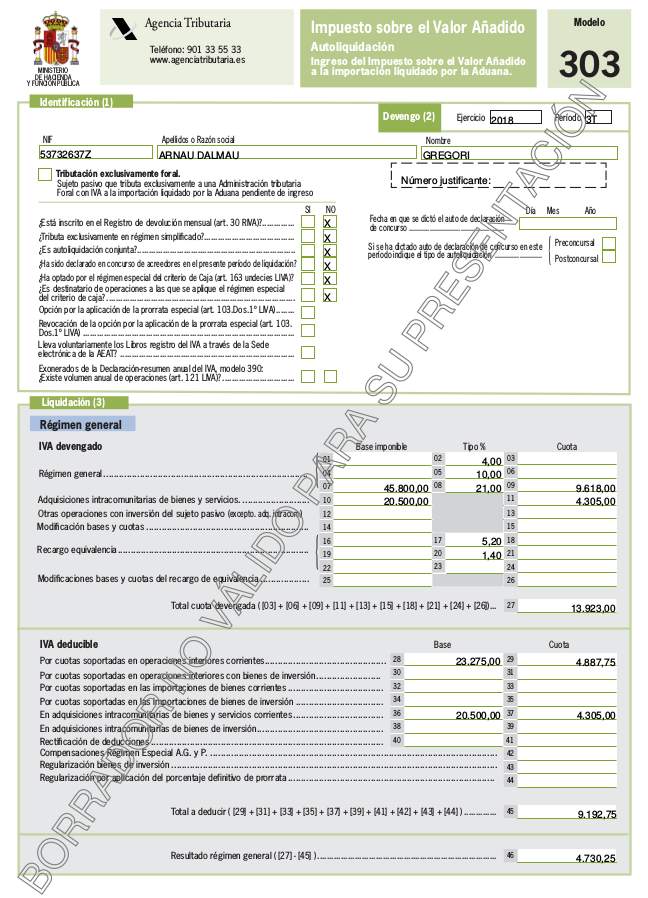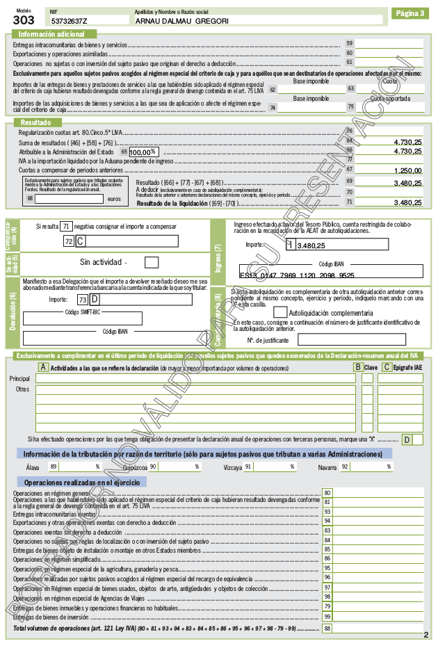 A la primera pàgina del model 303, s’han d’introduir les dades corresponents a l’IVA meritat i deduïble.
