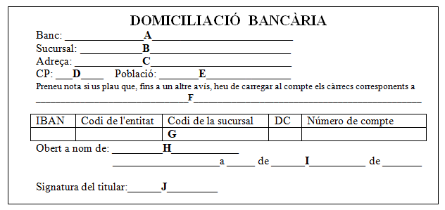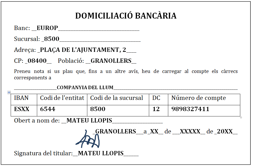 En aquest cas, en Mateu Llopis emplena el formulari de domiciliació bancària i el lliura a la seva entitat bancària (vegeu la figura).