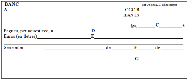 - B Número complet del compte bancari contra el qual s’emet el xec i IBAN.