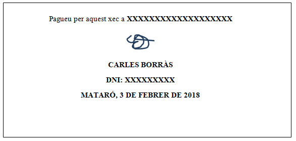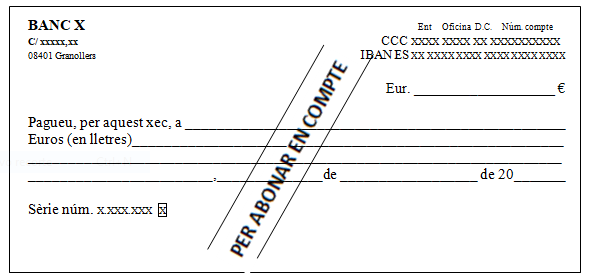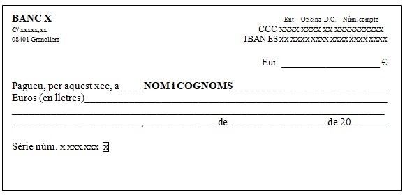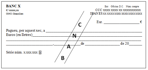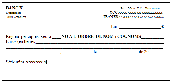 Aquest xec només el pot cobrar en Carles Borràs perquè hi figura el seu nom, i en el moment del cobrament l’haurà de signar al revers amb el seu DNI com es mostra en la figura.