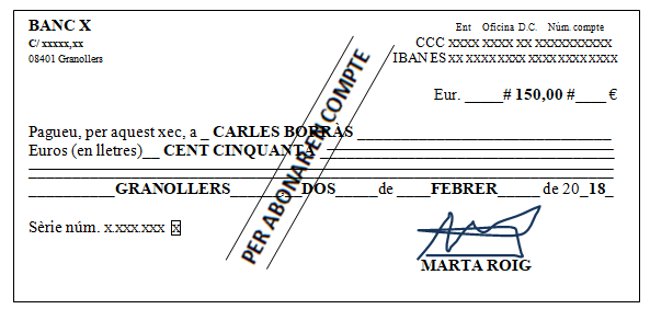 La Marta Roig, de Granollers, emet un xec el dia 2 de febrer del 2018 a favor d’en Carles Borràs, que té un establiment de distribució de productes florals a Mataró, per 150 EUR, que correspon a l’albarà número 75. La Marta disposa de xecs per abonar en compte. En aquest cas, la lliuradora (la Marta Roig) fa un xec especial per abonar en compte que només es pugui cobrar ingressant-lo en un compte corrent com es mostra a la imatge següent: figura)