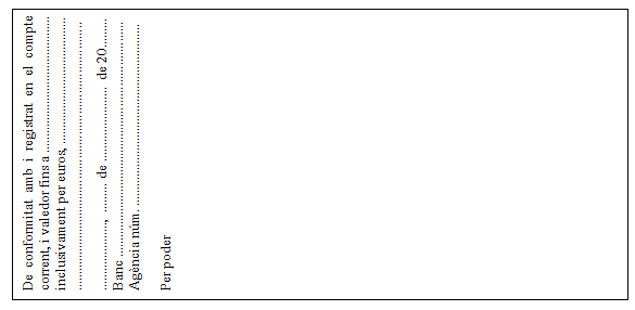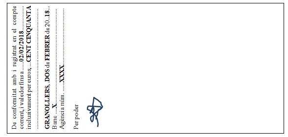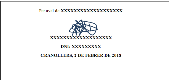 - Aval del xec: s’ha d’emplenar amb la fórmula “Per aval de…”, juntament amb la signatura de l’avalador (vegeu la figura).