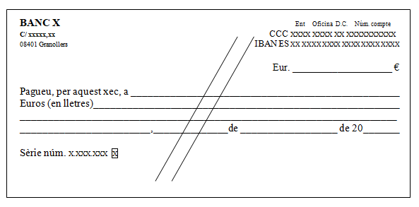 L’emplena amb les dades disponibles i, a més del nom d’en Carles Borràs, el xec s’ha barrat i entre les línies s’ha escrit Banc Z. Aquest xec només el podrà cobrar en Carles Borràs ingressant-lo en un compte del Banc Z, i l’haurà de signar al revers amb el seu DNI.