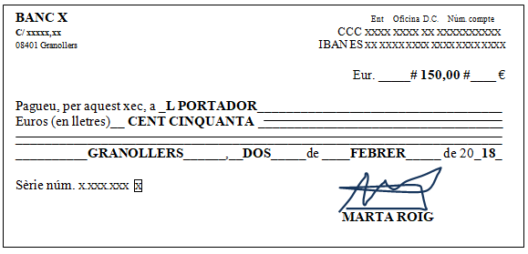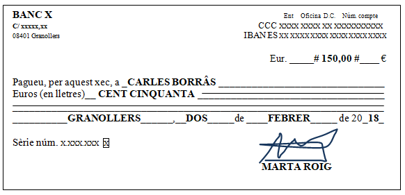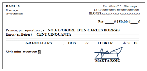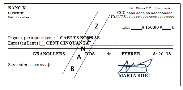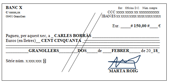 La Marta Roig, de Granollers, emet un xec el dia 2 de febrer del 2018 a favor d’en Carles Borràs, que té un establiment de distribució de productes florals a Mataró, per 150 EUR, que correspon a l’albarà número 75. En Carles Borràs demana que el xec el faci barrat perquè només es pugui cobrar en el Banc Z. En aquest cas, la lliuradora (Marta Roig) fa un xec nominatiu barrat que només es pugui cobrar ingressant-lo al Banc Z (vegeu la figura).