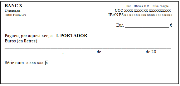 - Xec al portador: no es designa ningú per al cobrament i s’abona a la persona que el porti (vegeu la figura). Aquest tipus de xec es caracteritza perquè es paga a qualsevol persona que el presenti al cobrament. Actualment, la majoria d’entitats bancàries, encara que el xec sigui al portador, agafen les dades de la persona física o jurídica que el presenta a la finestreta per al cobrament.