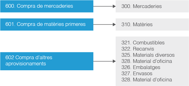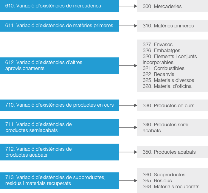 La relació entre els comptes de variació d’existències i el comptes del grup 3 d’existències és la següent:
