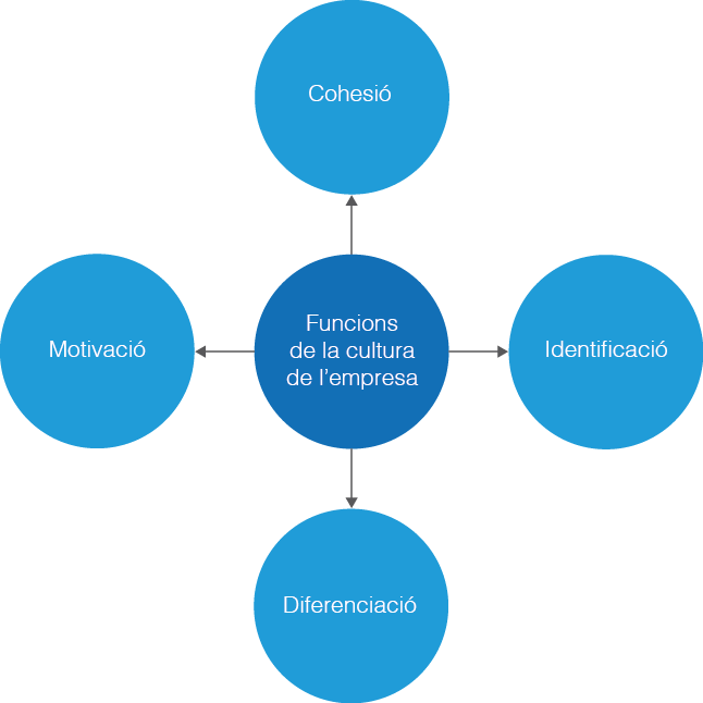 Dintre de les funcions de la cultura empresarial, a banda de la cohesió, identificació, diferenciació i motivació (aspectes vinculats a la part més interna de l’organització), s’hi ha d’afegir la necessitat d’enfortir la relació i la fidelitat amb el client a través de la transparència en el mercat (vegeu la figura). De manera que la cultura empresarial no és només el producte i el bon servei sinó també la confiança que es vol transmetre al client a través d’una bona relació.