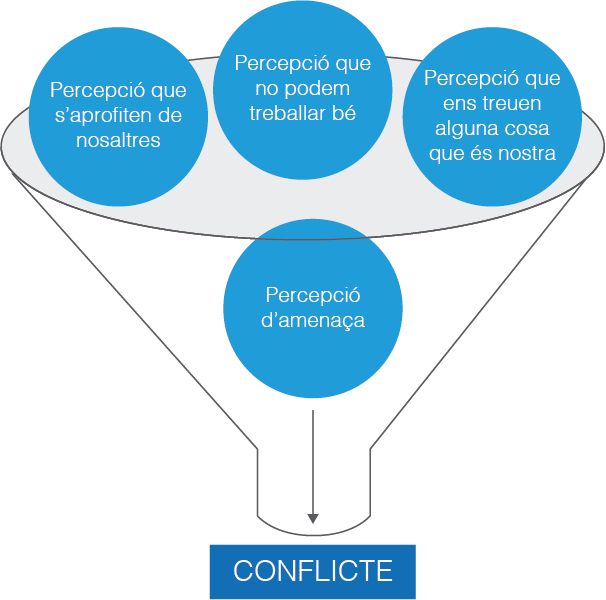 Hi ha un conjunt de percepcions que poden originar un conflicte. Per exemple, la percepció que s’aprofiten de nosaltres pot venir donada perquè el cap o un company ens ignora, ens menysprea o no ens agraeix un favor que hem fet, o bé ens dona un tracte pitjor que a altres persones. També es dóna la percepció que no podem treballar bé, que ens treuen alguna cosa que és nostra o que estem sota una situació d’amenaça. Totes elles vinculades a la recepció d’impressions i/o sensacions negatives. Això genera un diàleg interior en què ens preguntem per què se n’aprofiten, per què ens menyspreen, per què no ens reconeixen… que desemboca, finalment, en un conflicte (vegeu la figura).