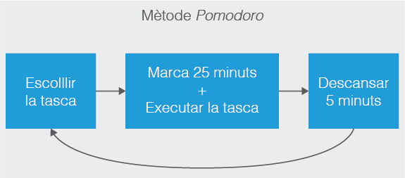 El mètode Pomodoro permet una administració del temps, de manera que utilitza un rellotge per dividir el temps dedicat a un treball en intervals de 25 minuts. Aquests intervals reben el nom de pomodoros i estan separats per pauses (vegeu la figura). La idea és basa en el concepte que si hi ha pauses freqüents es pot millorar l’habilitat mental. Els beneficis d’aplicar aquesta tècnica es reflecteixen en el càlcul de temps, l’aïllament necessari per a la concentració des de la flexibilitat i una millor compactació horària, ja que suposa menys interrupcions.