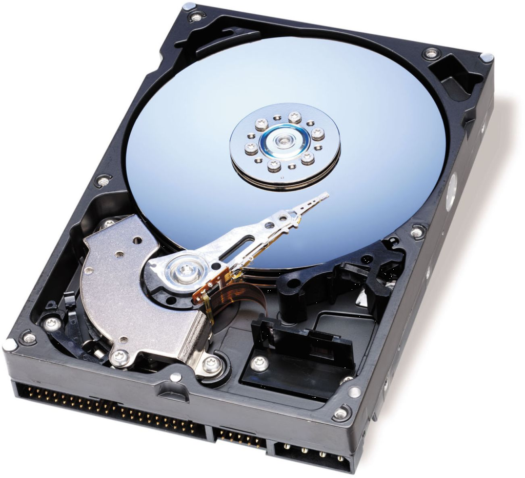 En la figura podeu veure l’aspecte interior d’un disc dur. Bàsicament està format per un conjunt de discos rígids superposats, que es llegeixen i s’escriuen mitjançant uns capçals electromagnètics que viatgen per la superfície del disc.