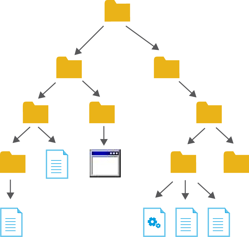 La majoria de sistemes organitzen els arxius informàtics de manera jeràrquica en el que anomenem carpetes o directoris. Com acabem de veure, una carpeta o directori és un tipus d’arxiu que pot guardar altres arxius i fins i tot altres carpetes; i aquestes altres carpetes també poden contenir més arxius i carpetes, i així successivament, construint un estructura d’arbre (vegeu la figura).