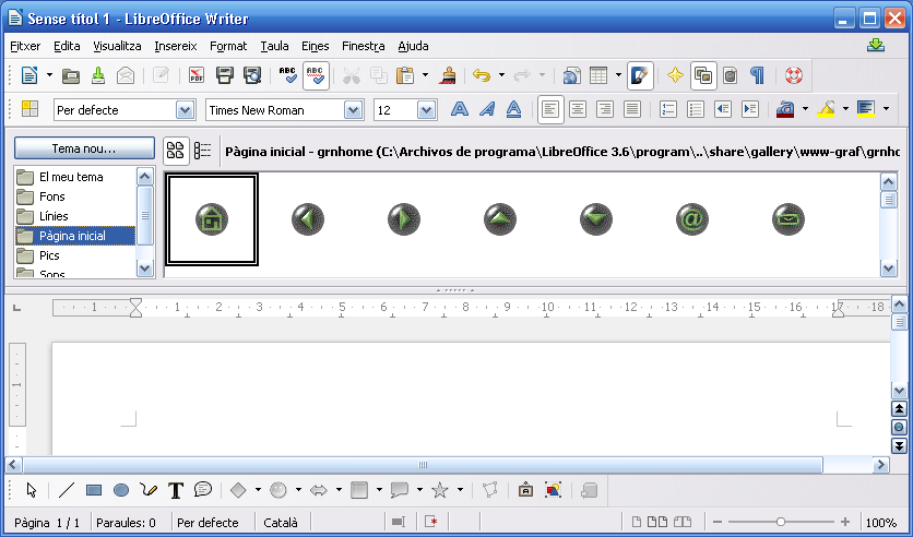 Les icones de la barra d’eines i les opcions del menú inactives del paquet LibreOffice es mostren de color gris.
