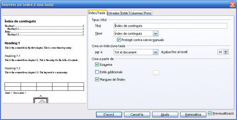 - Entrada de l’índex… permet editar l’índex de contingut del document prèviament creat des del menú Insereix.