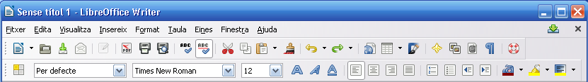 Les diferents barres d’eines i menús i moltes de les opcions del mòdul Writer són comunes als diferents components de LibreOffice. Les que apareixen per defecte en accedir a Writer són les que hi ha a la figura.