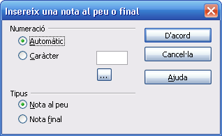 - Nota al peu/Nota final… és una informació addicional que s’ubica al final d’una pàgina o d’un document. Poden estar numerades, o bé indicades amb un símbol. Des d’aquesta opció podeu editar la nota que haurà estat inserida des del menú Insereix.