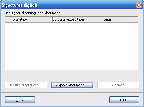 S’obrirà el quadre de diàleg Signatures digitals (figura) que permet afegir signatures digitals als documents i suprimir les signatures existents. També podeu visualitzar certificats.