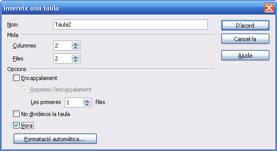 - Crea un resum automàtic… obre una finestra per indicar els nivells de capítol i paràgraf per nivell que tindrà el resum, i en acceptar crea un document de text nou segons les dades introduïdes.