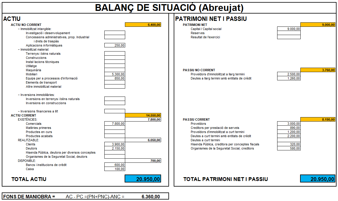 - Ràtio de disponibilitat = disponible / passiu corrent = 40.000 / 70.000 = 0,57