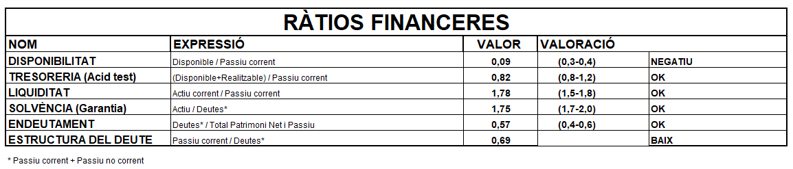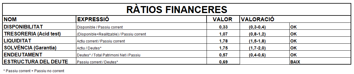- Ràtio de solvència o garantia = actiu / deutes = 400.000 / (90.000 + 70.000) = 2,50