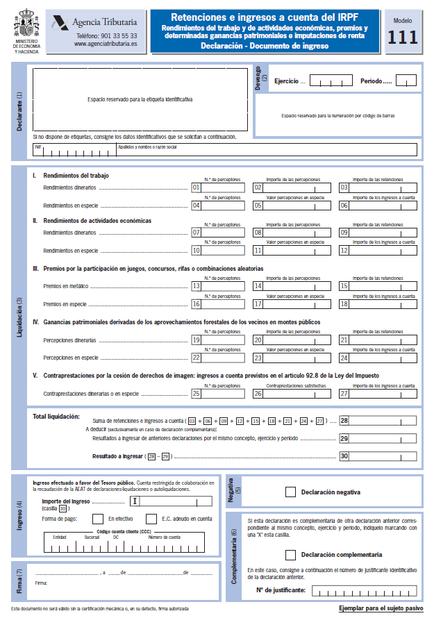 La presentació de la declaració-liquidació del model 111 s’efectua de manera electrònica a través d’internet. La utilització del format paper pràcticament es troba en desús o l’Administració en molts casos ja no ho permet.