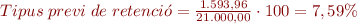7,59% · 21.000,00 = 1.593,90 € - No hi ha minoracions de l’import previ de la retenció.